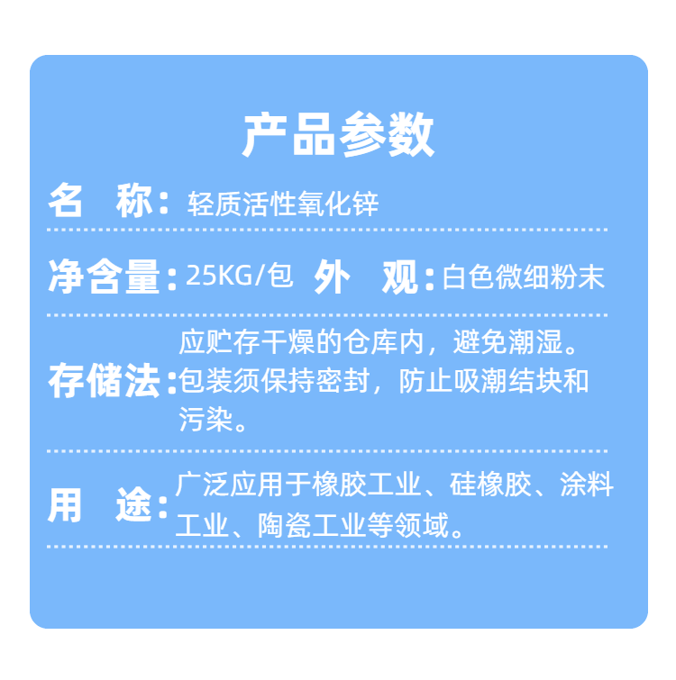 本品符合化工行業(yè)標準HG/T 2572-2020《活性氧化鋅》的要求,其主要技術指標如下: