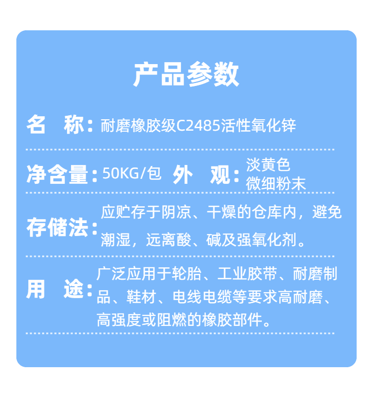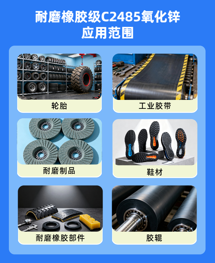 本品為橡膠工業(yè)設(shè)計(jì)的高活性氧化鋅,型號C2485,專門用于提升高性能橡膠制品的耐磨性、力學(xué)性能及硫化效率。采用特殊工藝制備,具有高表面活性和良好的分散性,適用于對耐磨性能有較高要求的橡膠制品。