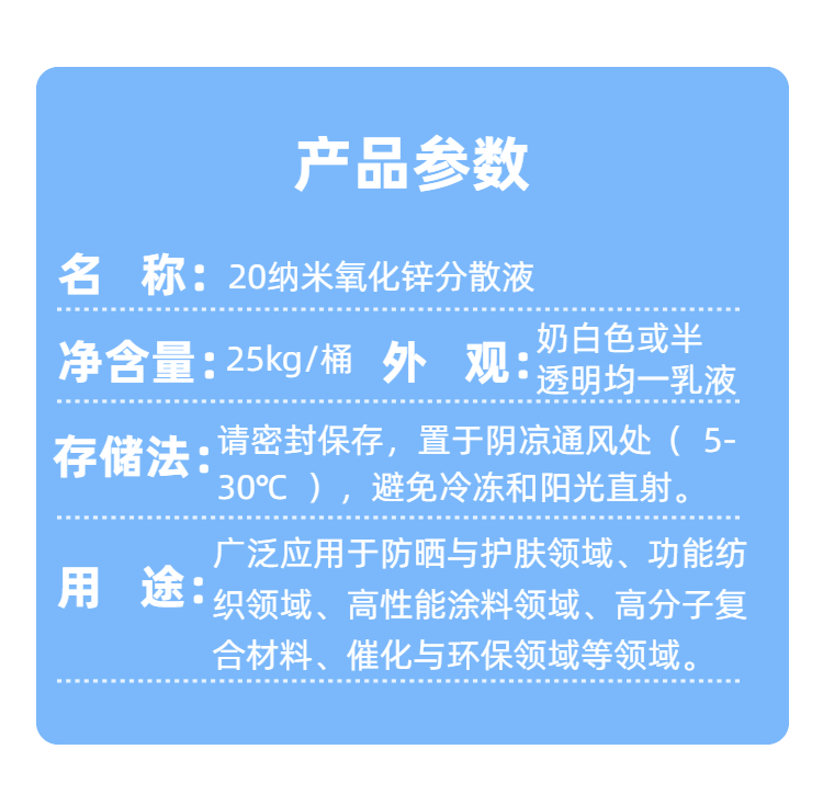 20納米氧化鋅分散液是由肇慶市新潤(rùn)豐高新材料有限公司采用高能球磨和液相化學(xué)法結(jié)合精密分散技術(shù)制備而成的一款高性能納米材料分散液。本品將平均粒徑約為20納米的氧化鋅顆粒通過(guò)獨(dú)特的表面改性劑均勻、穩(wěn)定地分散在水性介質(zhì)中,形成奶白色的均一分散體系。該產(chǎn)品有效解決了納米粉體易團(tuán)聚、難分散的行業(yè)難題,使用者可直接、高效地利用納米氧化鋅的優(yōu)異特性,輕松將其添加到各種基體材料中。