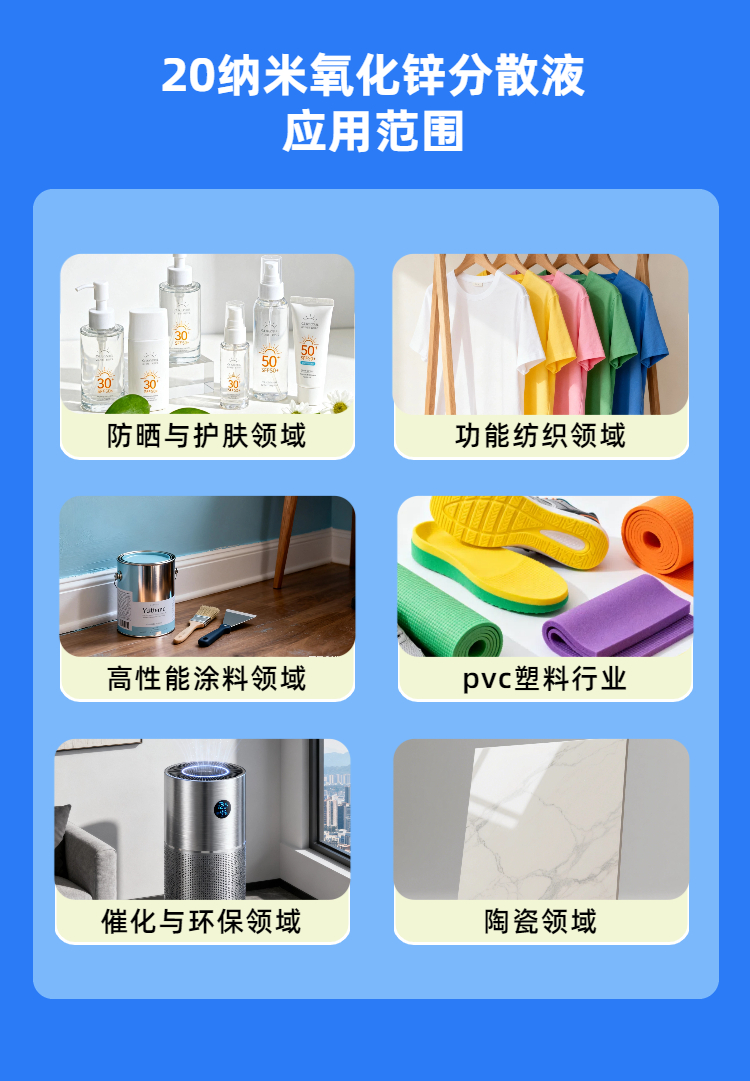 納米效應(yīng),性能卓越 :得益于20納米的原生粒徑,產(chǎn)品具有極強(qiáng)的紫外屏蔽(有效對(duì)抗UVA和UVB)、抗菌抑菌、光催化(如分解甲醛)及增強(qiáng)增韌等特性,能顯著提升終端產(chǎn)品的綜合性能。